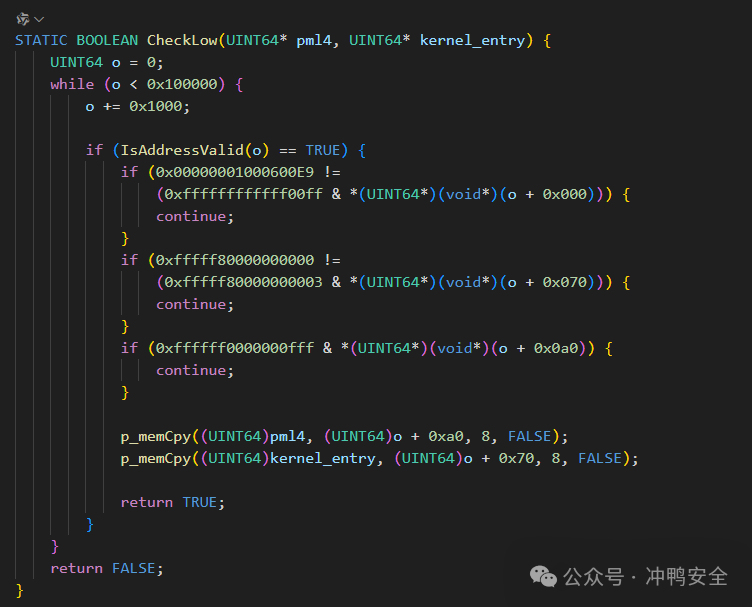 STATIC BOOLEAN CheckLow(UINT64* pml4, UINT64* kernel_entry)