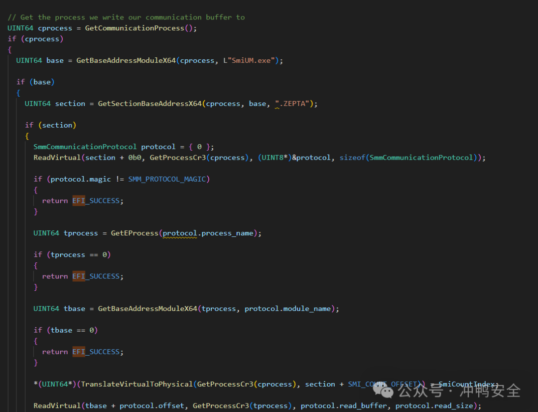 ReadVirtual(section + 0b0, GetProcessCr3(cprocess), (UINT8*)&protocol, sizeof(SmmCommunicationProtocol));