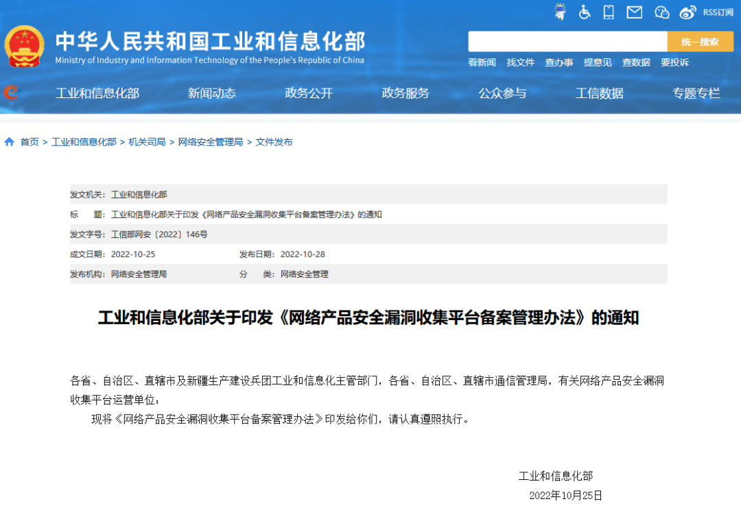 【安全圈】工信部印发《网络产品安全漏洞收集平台备案管理办法》
