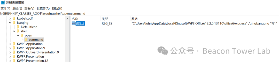 WPS程序安装后注册了一个名为 ksoqing 的自定义URL协议,注册表路径为:计算机\HKEY_CLASSES_ROOT\ksoqing\shell\open\command,其内容为”C:\Users\【用户名】\AppData\Local\Kingsoft\WPS Office\12.2.0.13110\office6\wps.exe” /qingbangong “%1″。即访问以ksoqing 开头的URL协议时,将启动wps.exe程序,并传递/qingbangong参数,%1则被替换为以ksoqing 开头的协议链接,一并作为wps启动的参数。