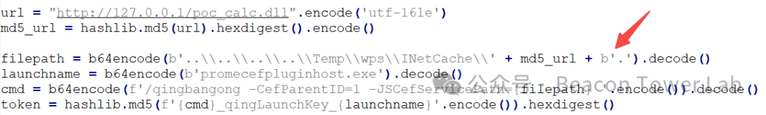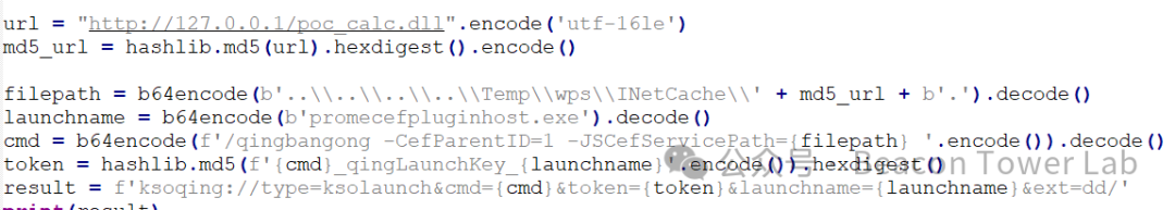 根据远程DLL的下载链接,使用poc.py计算下载后的文件名,并最终生成ksoqing协议链接。