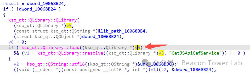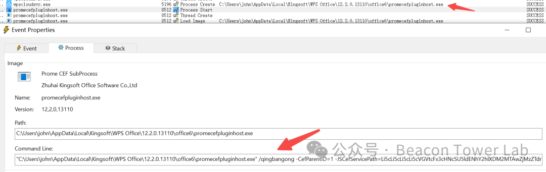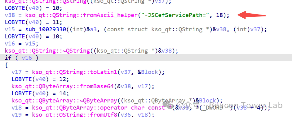 如果launchname参数指定的是promecefpluginhost.exe,该程序启动后,将加载ksojscore.dll,然后解析命令行中的-JSCefServicePath。