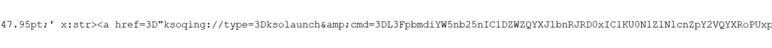 wpscloudsvr.exe中的qingbangong.dll解析自定义URL链接内容。当type参数为ksolaunch时,将启动launchname参数指定的程序,参数使用base64编码。