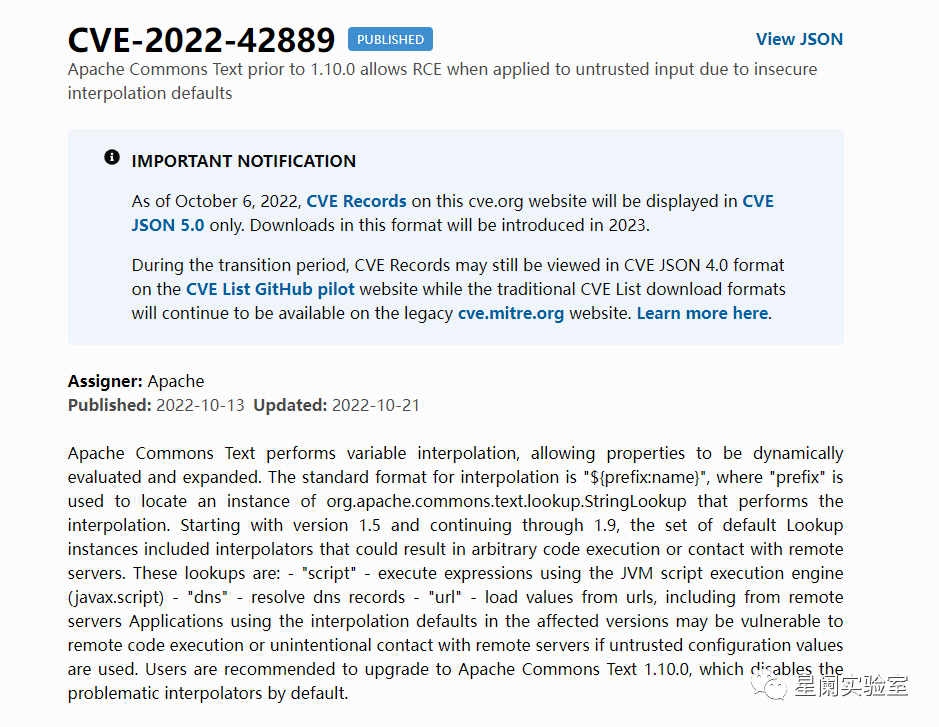 2022年10月13号,官方发布了Apache Commons Text的漏洞通告,漏洞编号:CVE-2022-42889。Apache Commons Text 执行变量插值,允许动态评估和扩展属性。插值的标准格式是“${prefix:name}”,其中“prefix”用于定位执行插值的。org.apache.commons.text.lookup.StringLookup 的实例。从 1.5 版到 1.9 版,攻击者可构造恶意文本,使得Apache Commons Text 在解析时执行任意恶意代码。