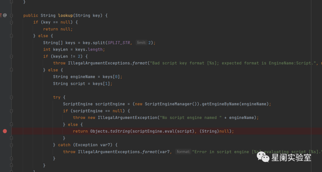 到这里,正如开头所分析的那样lookup方法会提取”:“后的部分作为 prefix 值,然后根据 stringLookupMap 提取其对应的 lookup 实例化对象,最后通过调用ScriptEngineManager执行代码。