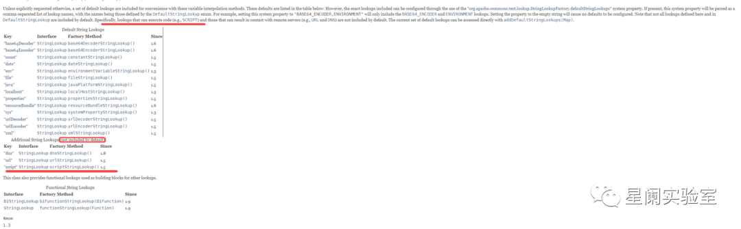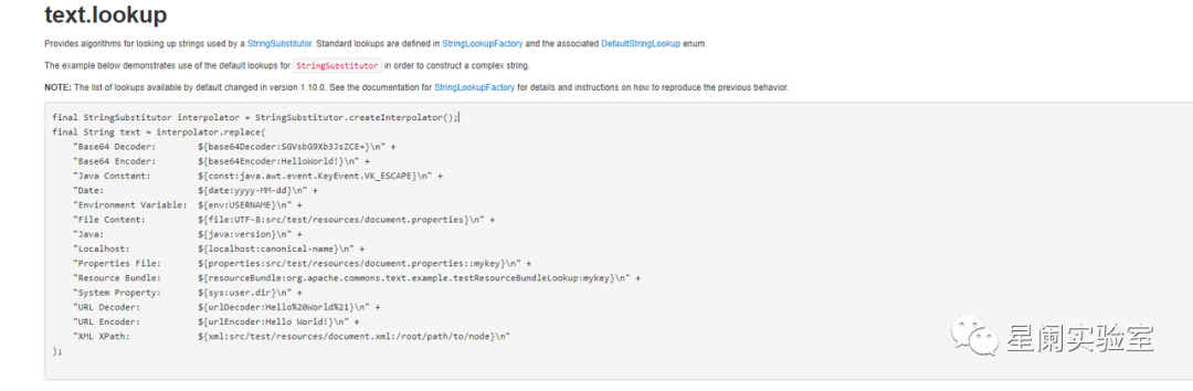 这里演示了使用默认查找StringSubstitutor来构造复杂字符串的用法,而漏洞描述中的关键所在就是执行变量插值,其标准格式是${prefix:name}。