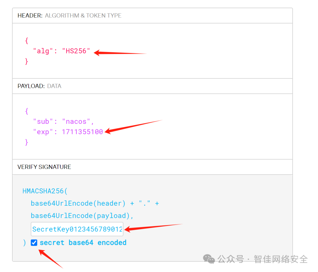 JWT设置Header为HS256,payload中exp为较大时间戳(比如当前时间+5小时后的时间)unix时间戳转换的结果,签名就是用前面的key并且base64编码