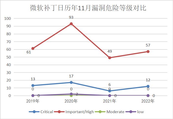 2019-2022年,11月份的漏洞危险等级趋势和数量如下图: