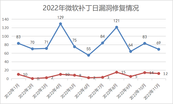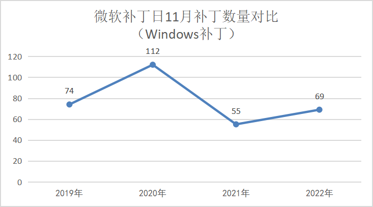 微软在2022 年 11 月份爆发的漏洞相较于去年有少量的增加。本月出现了69个漏洞补丁,并且有12个 Critical 类型的漏洞补丁。