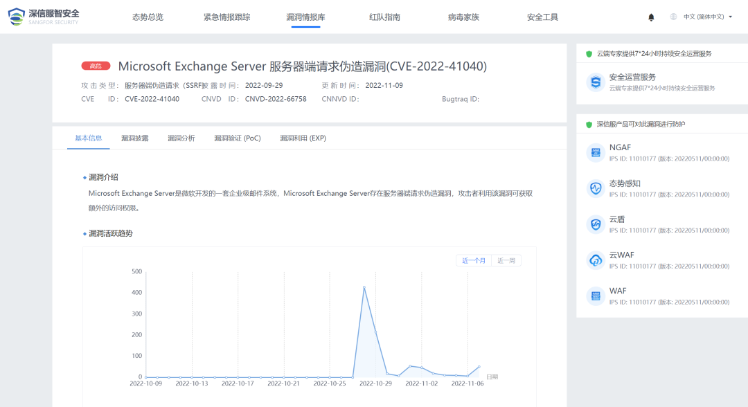 2.安全防护 支持对 CVE-2022-41040 的防御,可阻断攻击者针对该事件的入侵行为,相关产品及服务如下:【深信服下一代防火墙AF】已发布防护方案。