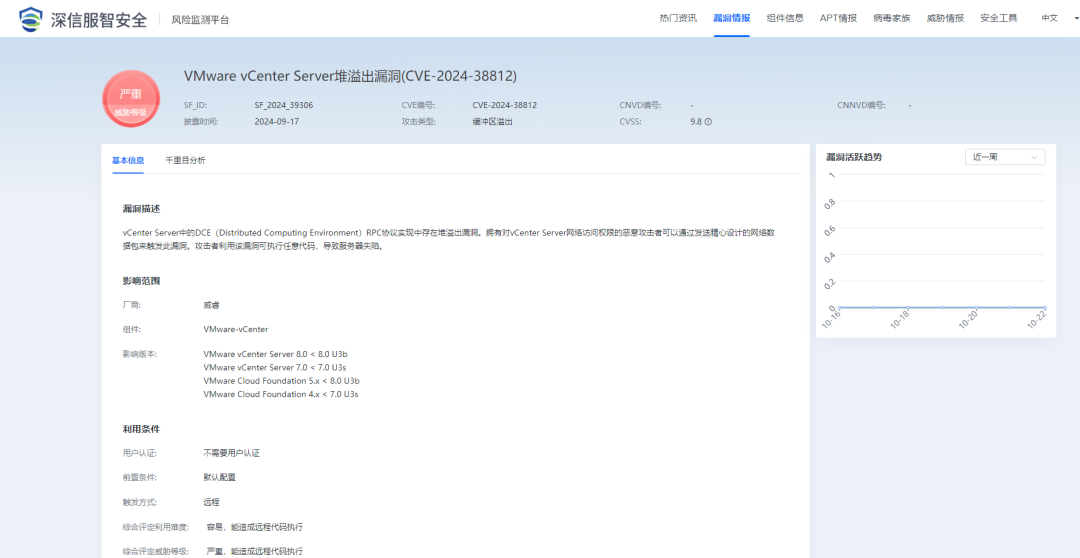 2024年9月19日,深瞳漏洞实验室监测到一则VMware-vCenter组件存在堆溢出漏洞的信息,漏洞编号: