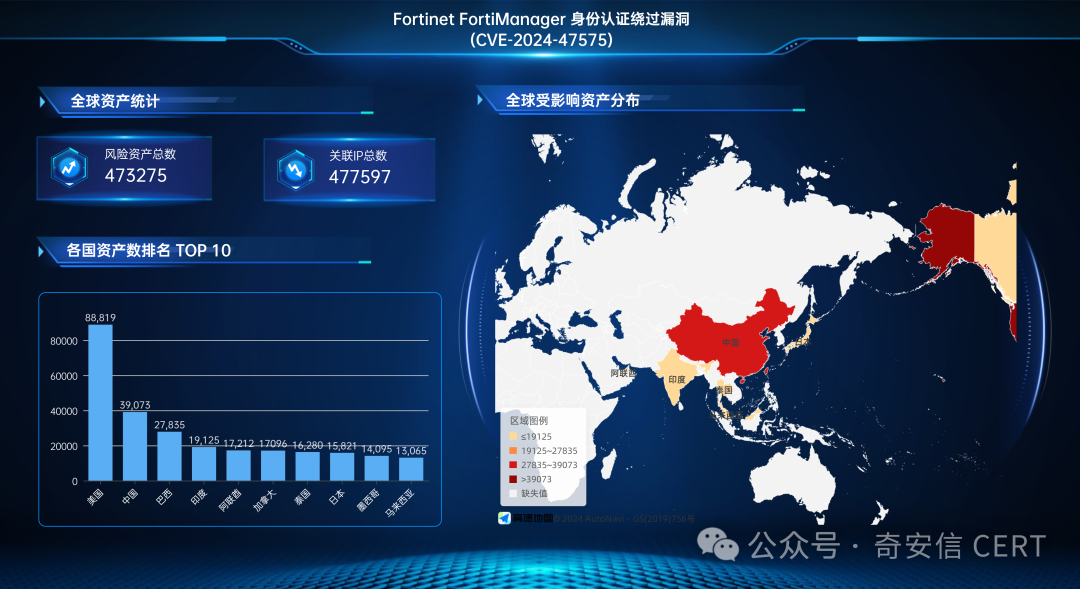 Fortinet FortiManager 身份认证绕过漏洞(CVE-2024-47575)关联的全球风险资产总数为473275个,关联IP总数为477597个。全球风险资产分布情况如下:
