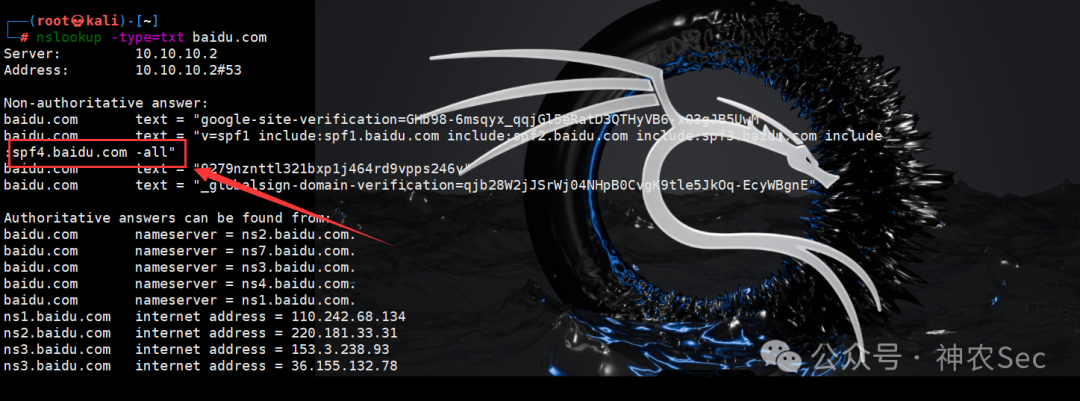 我们直接拿baidu.com的域名来给大家演示下,用kali的nslookup 工具测试下