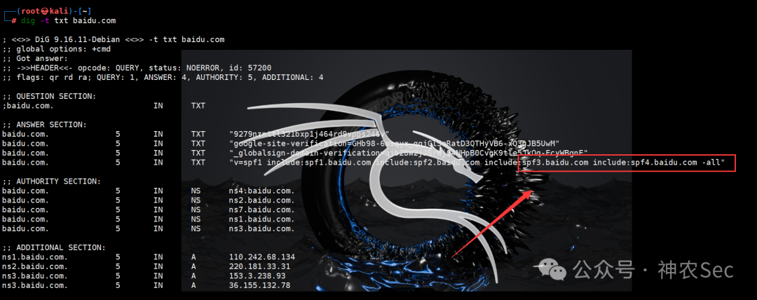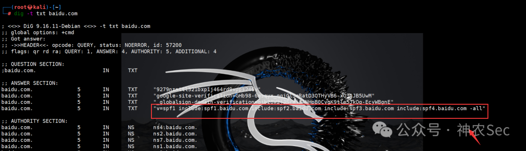 可以看到下面的回显,存在spf记录,是-all参数,说明不能任意伪造。