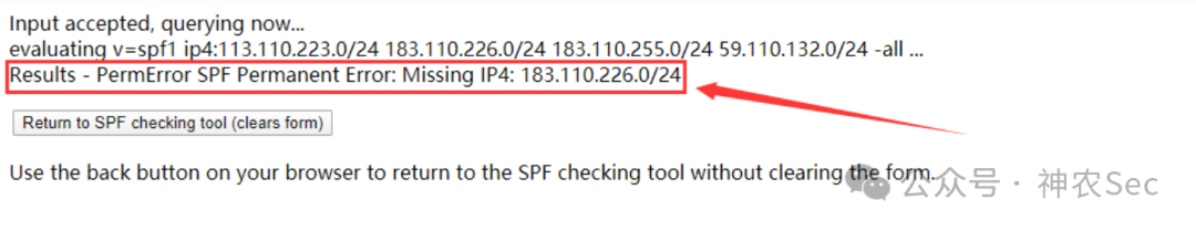 SPF记录报错,在这条SPF记录中,存在多个IP段,但只有开头的一段ip用了ipv4,这就导致了语法错误。因为这个错误,将导致整个SPF记录完全失效,因为SPF无效,邮件接收方的SPF检测功能也就失效了。