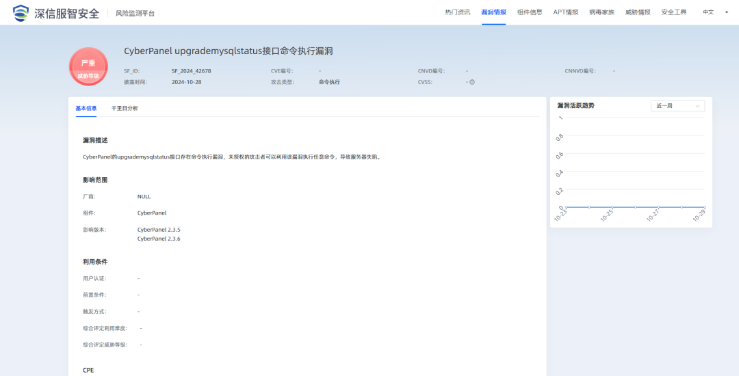 2024年10月30日,深瞳漏洞实验室监测到一则CyberPanel组件存在命令执行漏洞的信息,漏洞威胁等级:严重。