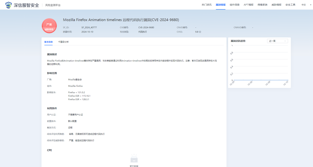 【漏洞通告】Mozilla Firefox Animation timelines远程代码执行漏洞(CVE-2024-9680)