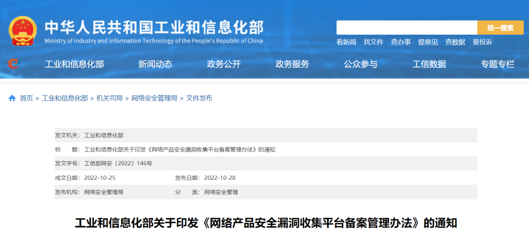 工信部发布《网络产品安全漏洞收集平台备案管理办法》