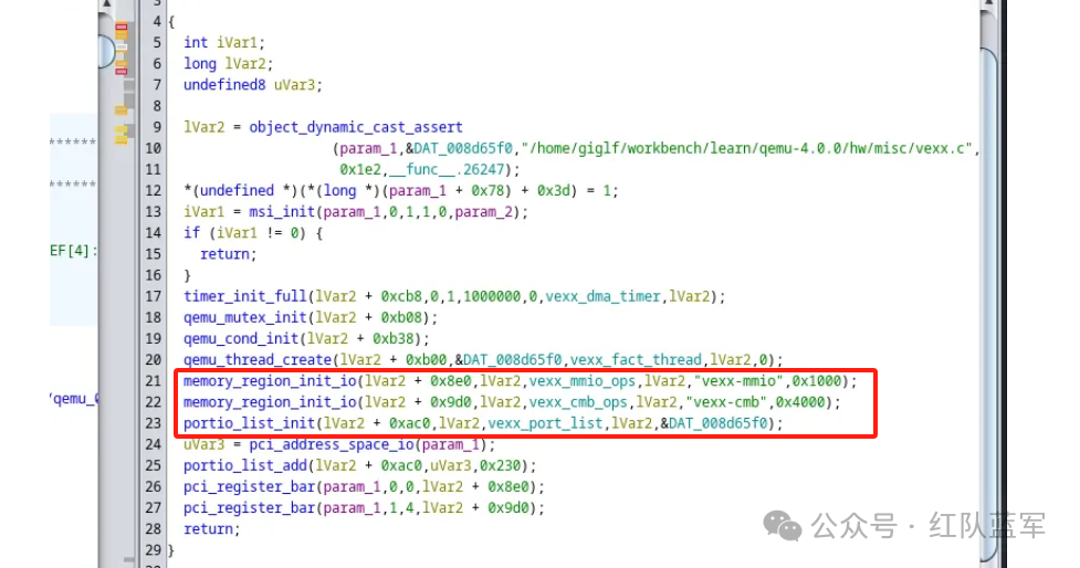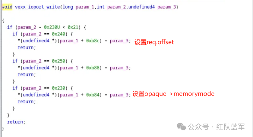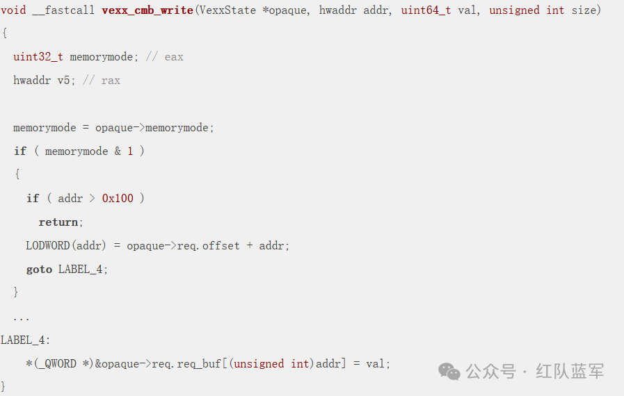 对MMIO区域和I/O端口涉及到的函数进行分析,在vexx_cmb_write函数中存在漏洞