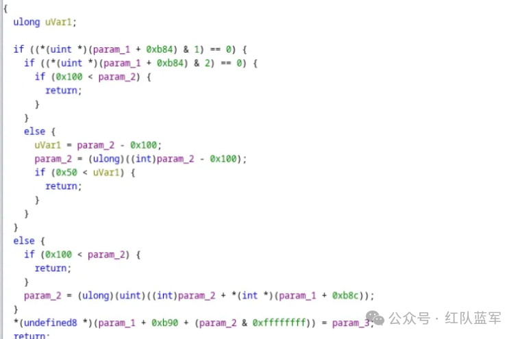 虽然限制param_2的大小在缓冲区的范围内,确保它不超过255字节(0x100),但param_2又被增加了一个偏移量,这个偏移量是一个由攻击者控制的值。通过查看与MMIO和端口I/O相关的其他函数,可以看到偏移量变量和memorymode值都可以通过写入特定的I/O端口来控制