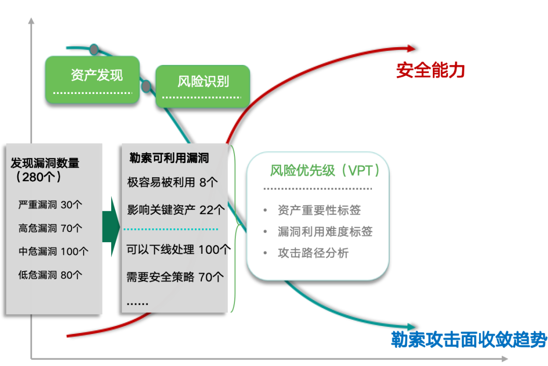 通过帮助用户提前收敛暴露面并修复已知易被勒索攻击的漏洞,避免脆弱点暴露于攻击者面前。如曲线图所示,随着勒索攻击面的不断收敛,攻击面越来越小,从而企业防御勒索的安全能力随之升高。