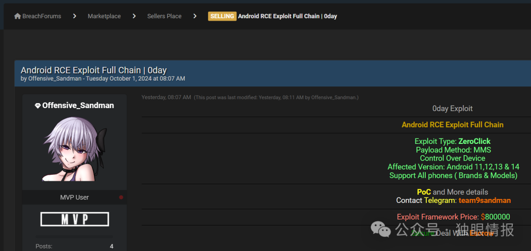 潜在买家被要求通过 Telegram 联系威胁者,以便分享更多细节和概念验证 (PoC)。如果该漏洞真实存在,将造成毁灭性后果,攻击者可以远程控制设备并可能访问敏感个人信息,而用户却浑然不知。