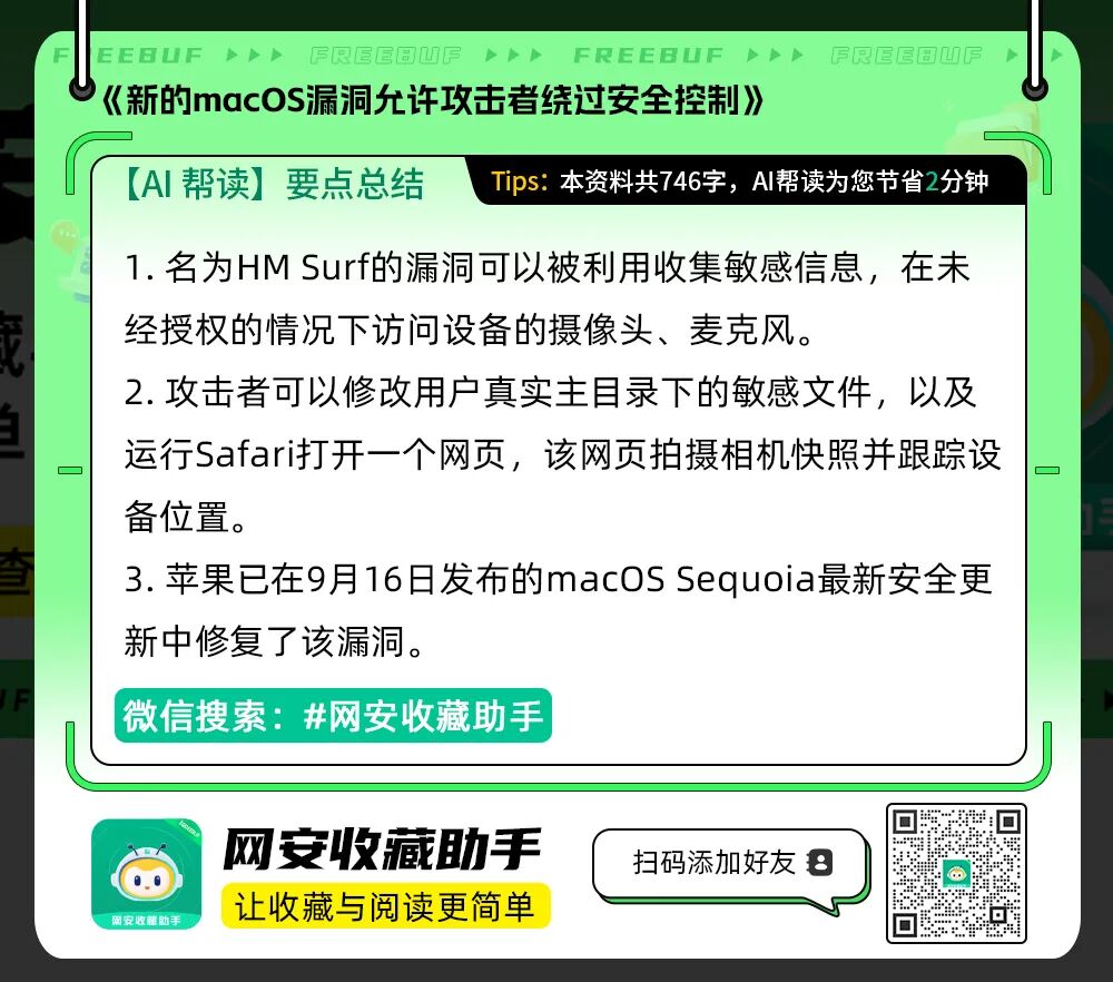 据Cyber Security News消息, 微软威胁情报发现,macOS出现了一个名为“HM Surf”的新漏洞,能允许攻击者绕过操作系统的透明、同意和控制(TCC)技术,在未经授权的情况下访问用户受保护的数据。