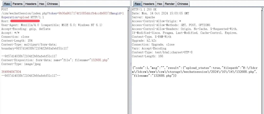 漏洞链接:http://xx.xx.xx.xx/crm/wechatSession/index.php?token=9b06a9617174f1085ddcfb4ccdb6837f&msgid=1&operation=upload