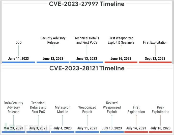报告中引用了两个例子——CVE-2023-28121(WordPress 插件)和 CVE-2023-27997(Fortinet FortiOS)来证明公开漏洞与恶意活动之间并不存在一致的关系。在第一个例子中,漏洞在披露3个月后和概念验证发布10天后开始被利用;在第二个例子中,漏洞在被公开之后就立刻被武器化,但真正的第一起利用攻击事件直到4个月后才被记录到。