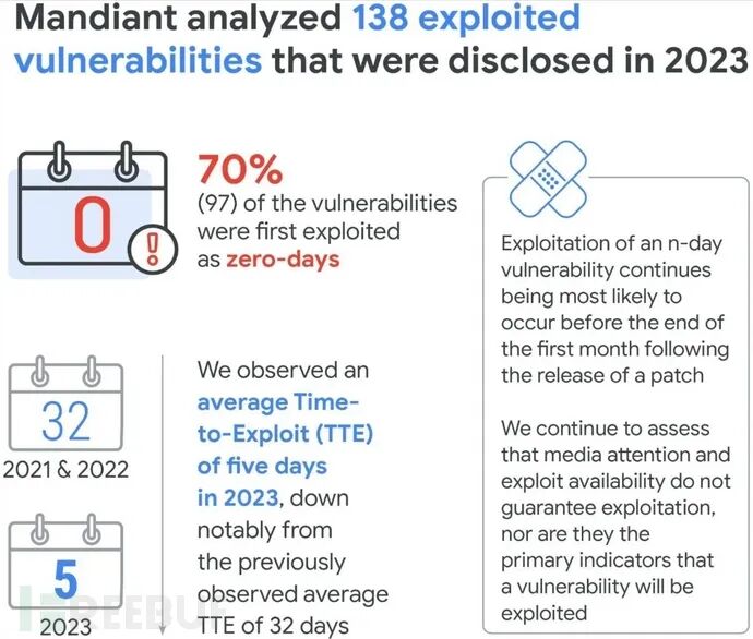 与此相关的是,谷歌认为漏洞利用的公开与TTE之间没有关联。2023 年,75% 的漏洞利用在黑客利用开始之前就被公开,25% 的漏洞是在黑客已经利用这些漏洞后发布。