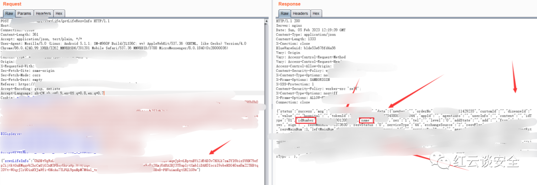 这里你会惊奇的发现下面请求包中的一大串加密数据就是上面使用卡券号签名生成的数据,返回包中包含身份证号姓名地址等各种敏感信息!