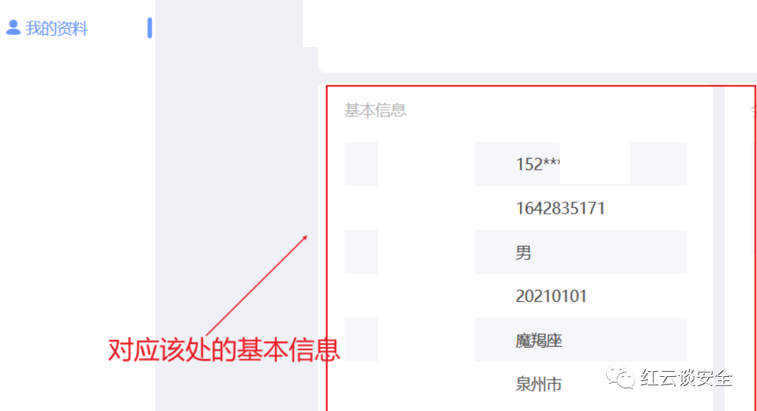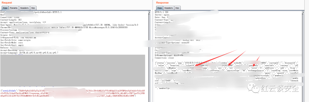 为进一步证明危害,我通过在这个系统中抓到一个获取到个人信息的数据包(我们在测试时,如果遇到返回数据包中有敏感数据的时候一定要特别注意,因为这往往是一个个突破点,有敏感数据你脑袋中能够想到有哪些漏洞?越权?CORS?)