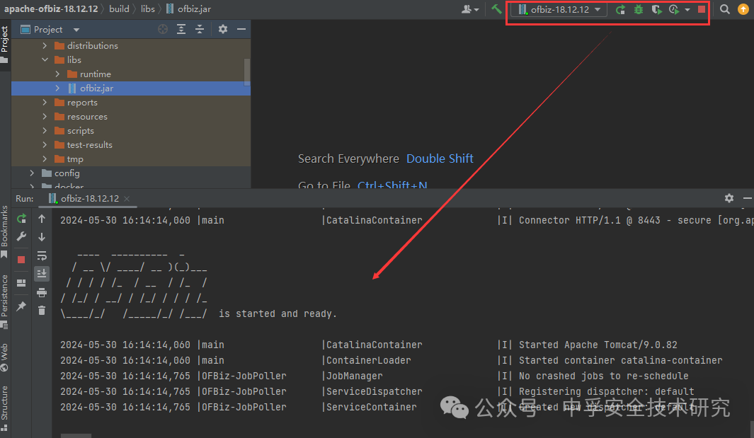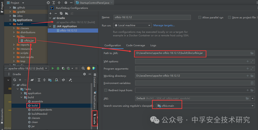 解压后用 IDEA 打开,点击右侧栏 Gradle 中的 build 之后会生成一个 biuld 目录,该目录下面会生成一个 ofbiz.jar,Run/Debug Configurations 中会自动生成一个 Gradle 配置项;