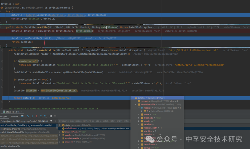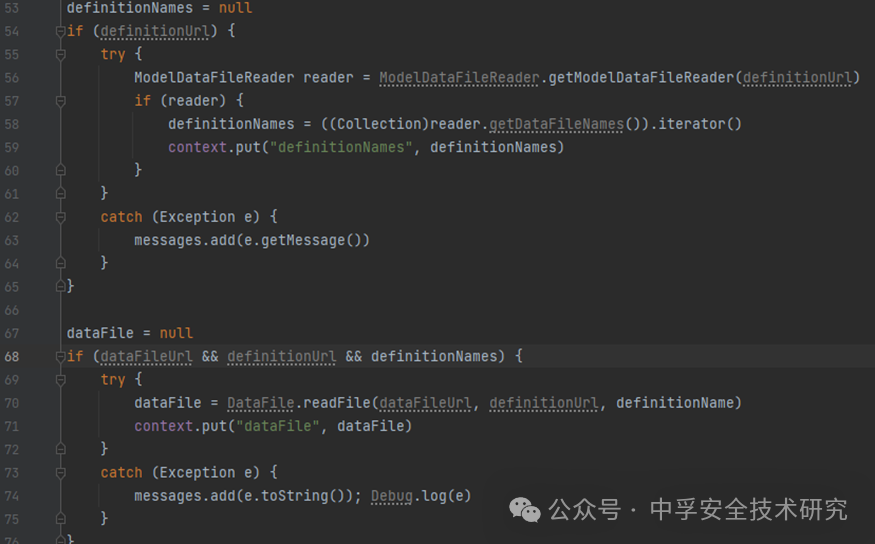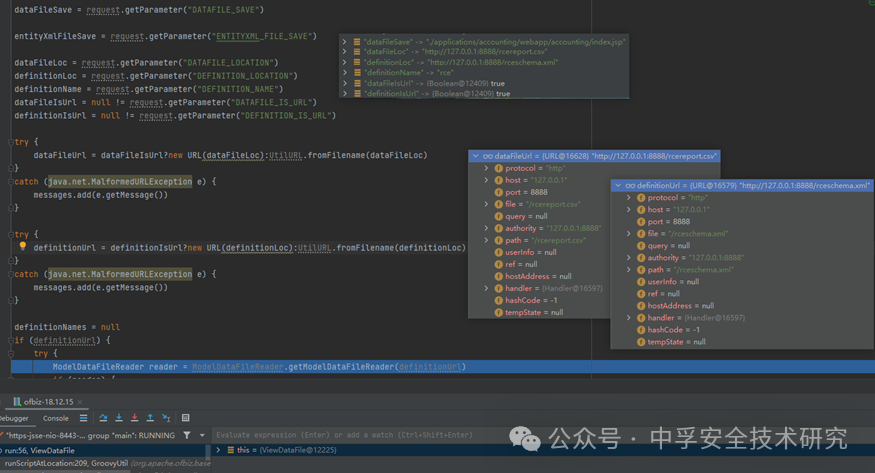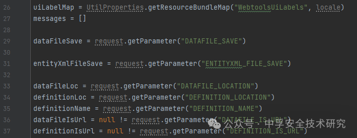 进入 ViewDataFile.groovy,获取了前端传入的参数,dataFileSave 为数据文件写入的文件路径,dataFileLoc 为数据文件的 URL 地址,definitionLoc 为xml定义文件的URL地址,definitionName 为定义文件中定义的名称。