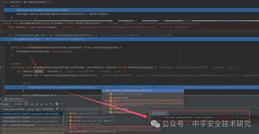 也就是说,该文件实现了一个数据读取和写入的功能,并且能解析 JSP 文件,也就是能通过写入JSP shell 来实现命令执行。