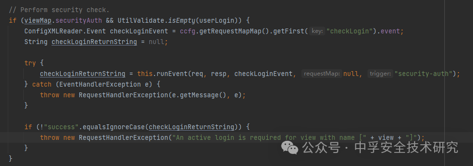 当满足 viewMap.securityAuth 为true,且当前为未登录状态时,就会进入if分支,进行登录校验,登录失败则抛出异常,停止视图解析。