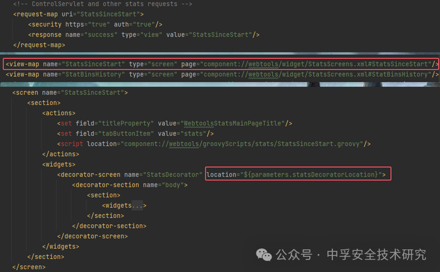读取 StatsScreens.xml 文件,逐层解析标签到 StatsDecorator 装饰器,从前端 statsDecoratorLocation 参数获取到远程 StatsDecorator 定义文件的地址。