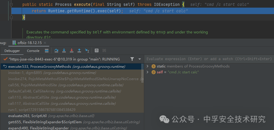 run() 执行该脚本,调用 ProcessGroovyMethods.execute() 执行系统命令。