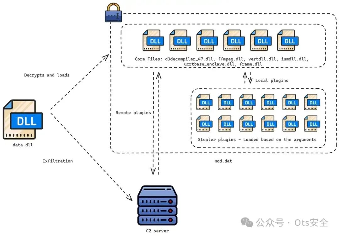 核心组件始终包含在 VFS 文件中,但 Volexity 只能frame.dll在 C2 服务器上找到它们。虽然 DEEPDATA 插件存储在 VFS 文件中,但它们也作为自己的专用文件存储在 C2 服务器上;它们可以从任一位置加载。VFS 中的 DEEPDATA 插件使用与 VFS 中其他组件相同的密钥进行解密。
