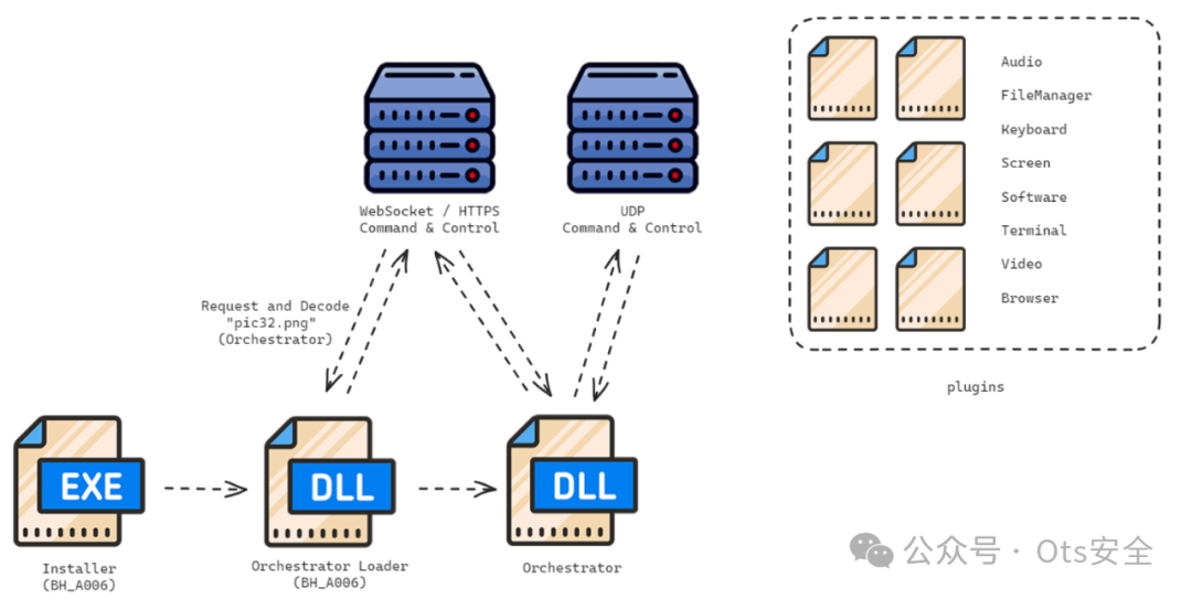 这些样本使用的加载器是BH_A006,它过去曾用于加载其他恶意软件家族。目前尚不清楚这是否是商业上可用的加载器,还是不同运营商共享开发能力的证据。执行链的摘要如下。