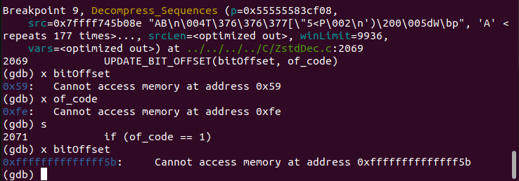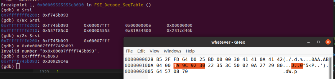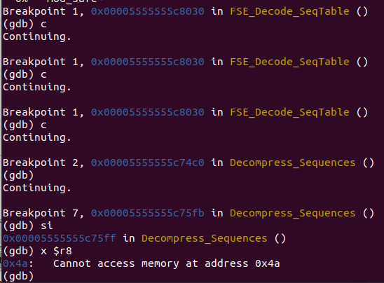 将其放回 GDB 中将显示我们通过了对FSE_Decode_SeqTable