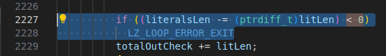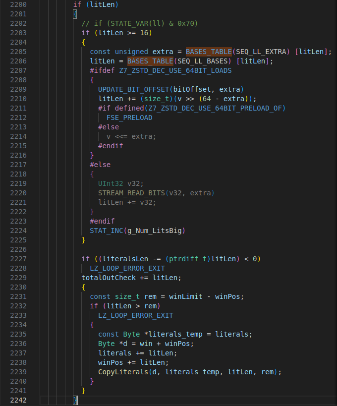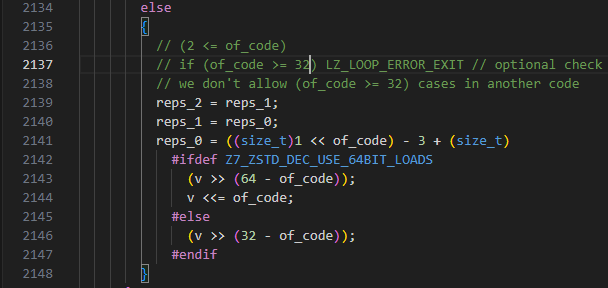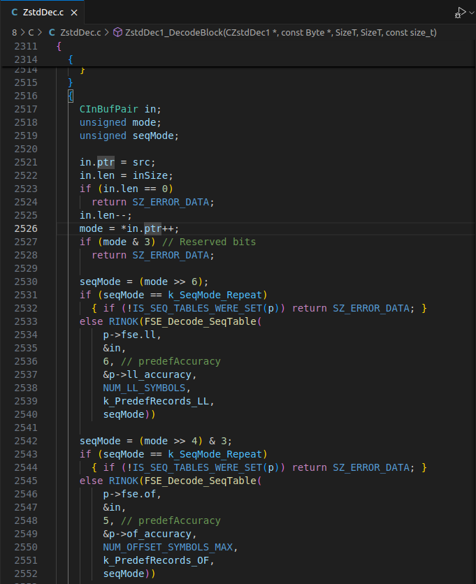 函数,它专注于对 Zstd 格式文件中存在的三种序列表进行某种处理(目前还不确定)——字面长度、偏移量和匹配长度,根据 RFC。您可以看到添加的代码只是检查大小,以确保一个神秘的sym