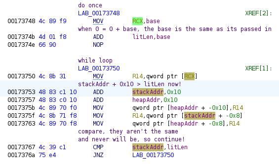 …高亮的指令是失败的地方。似乎我们在这个宏循环中无限循环,使用我们虚假的表索引,这导致我们遍历整个堆,直到它崩溃,因为它试图写入堆的末尾。这很酷,但它试图写入什么?