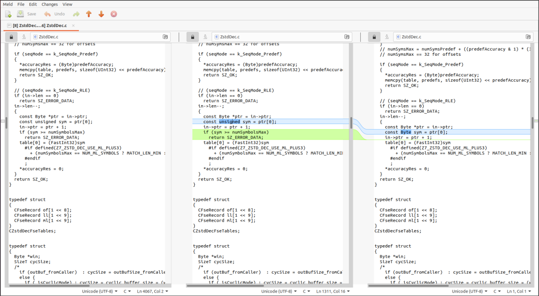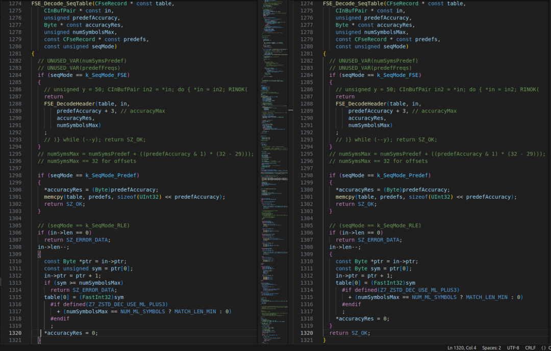 我首先专注于对比“ZStdDec.c”文件,我有一种预感它可能与 ZStandard 解压缩有关。