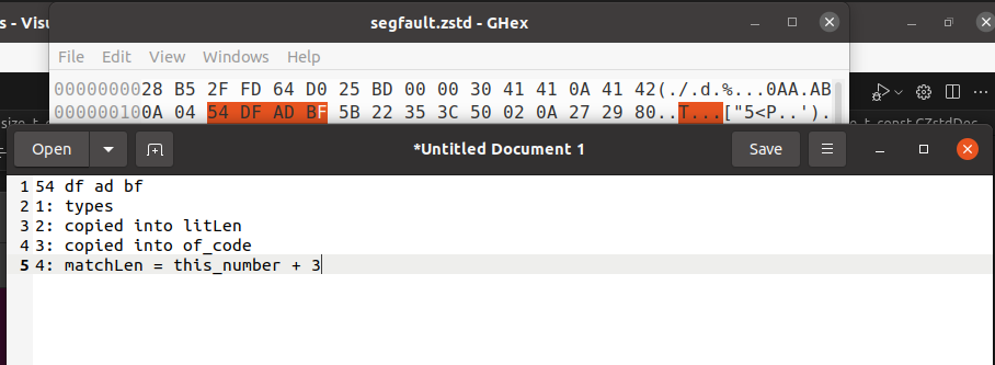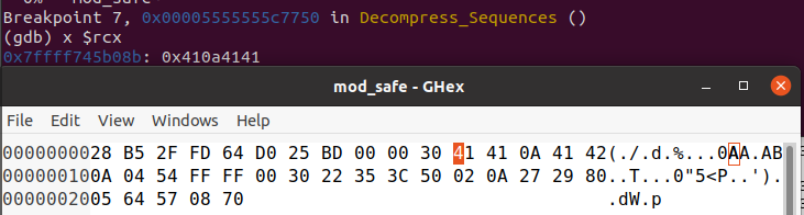 这意味着我们可能也超出了被复制的“表”的任何数据的边界,因为这些从文件中读取的值是 Zstd 解压缩用来重建二进制文件的。这份文件仅由 A、B 和换行符(0x0a)组成,因此在这里复制的字节中会看到 ASCII A 和 ASCII B。