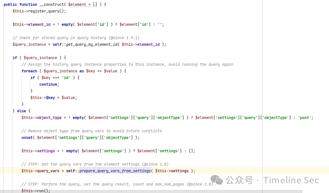 可以看到query.php的Query类构造函数(__construct)能够直接触发prepare_query_vars_from_settings,需要的条件是进入else循环中,也就是element数组中的id的值为空即可。