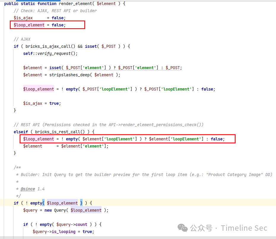 在ajax.php#render_element中存在Query的实例化,需要的条件就是$loop_element为false,而其初始值为false,这里设置了ajax与rest api这两种请求方式。非ajax请求element参数下没有参数loopElement,$loop_elemet 将被置为 false ,即保证POST请求中保持没有loopElement即可保持为false。