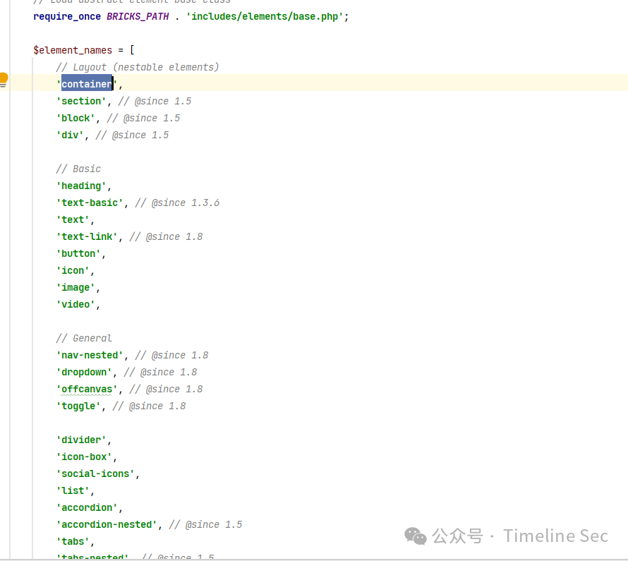 在elements.php中,初始化定义了很多name的名称,理论上这些初始化定义的应该都是存在可用的,因此POC里面的name也可以是 section、block、div等
